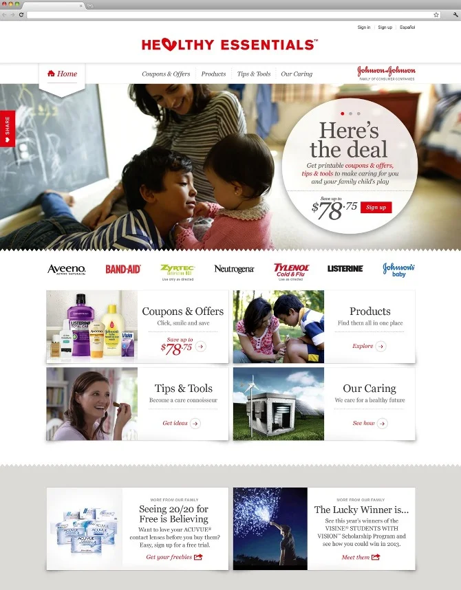 For Johnson & Johnson, we needed to grow the user base of their multi-brand loyalty program. So we developed Healthy Essentials, a unified consumer website for brand resources. As the writer on the project, beyond building this umbrella brand, I knew we needed to provide more than just coupons and sweepstakes. I helped reimagine the program from the ground up as a multichannel lifestyle content ecosystem to connect and engage with users.